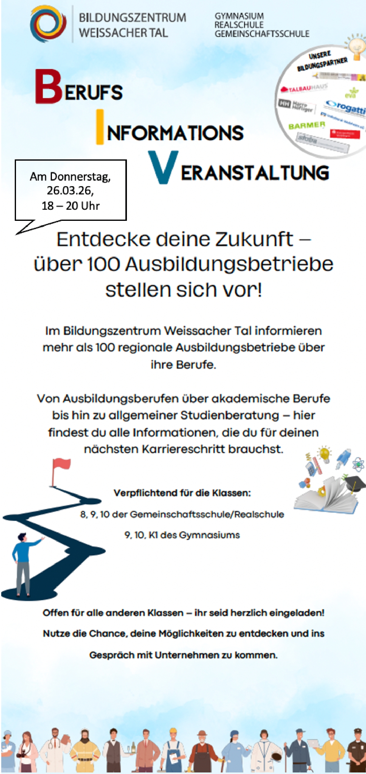 Am 26.3.2026 von 18-20 Uhr informieren mehr als 100 regionale Ausbildungsbetriebe über Ihre Berufe. Klicken Sie auf "weiterlesen", um den Flyer und die Übersicht über die Stände zu sehen.