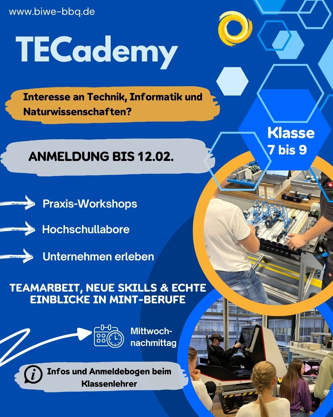 Du bist in Klasse 7–9 und interessierst dich für Technik, Naturwissenschaften oder Informatik? Dann ist die TECademy genau das Richtige für dich!
